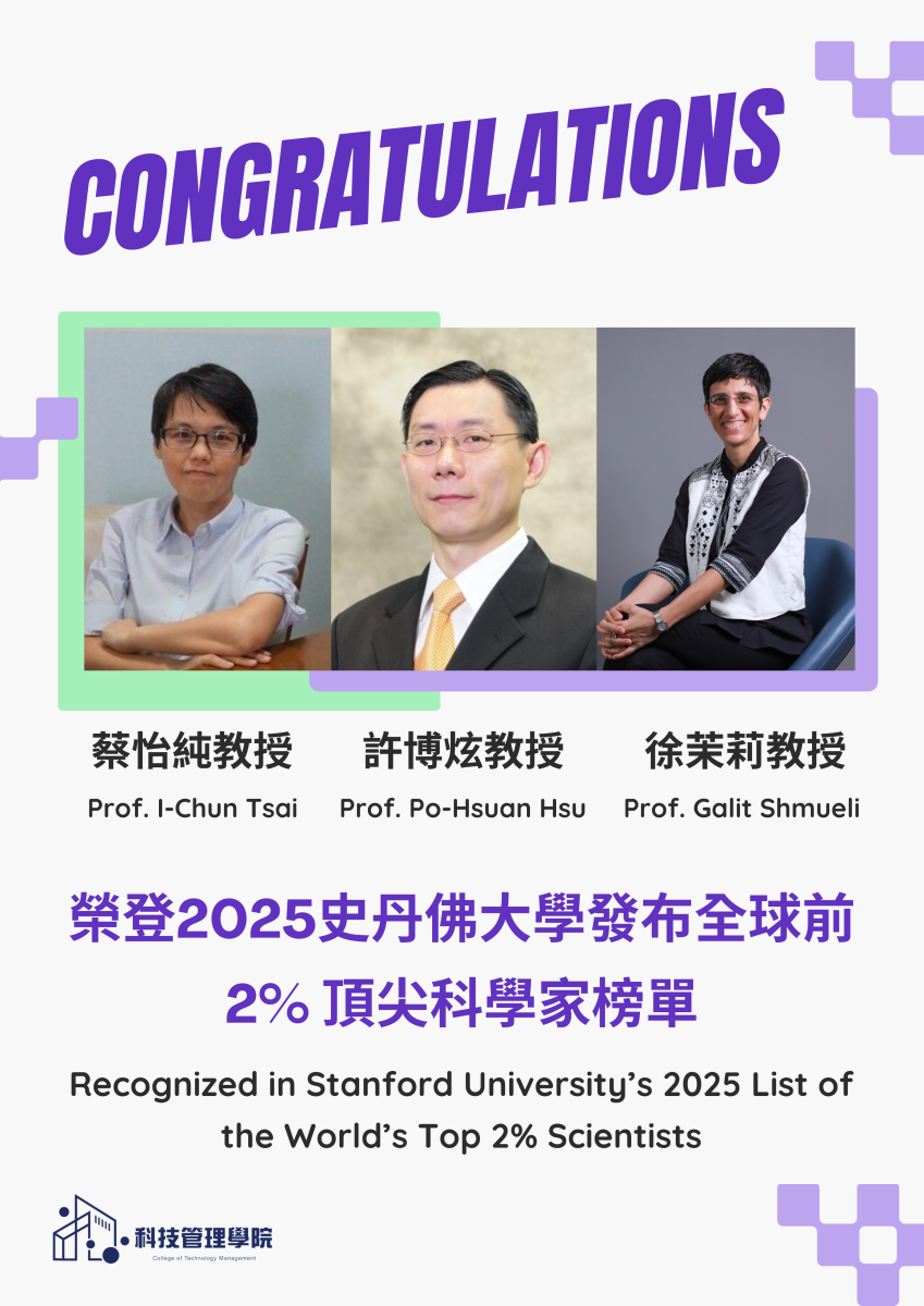 The College of Technology Management (CTM) is proud to share exciting news once again! Prof. Galit Shmeuli (Institute of Service Science), Prof. I-Chun Tsai (Department of Quantitative Finance), and Prof. Po-Hsuan Hsu (Department of Quantitative Finance) have been named among the World’s Top 2% Scientists 2025, a prestigious ranking released by Stanford University.