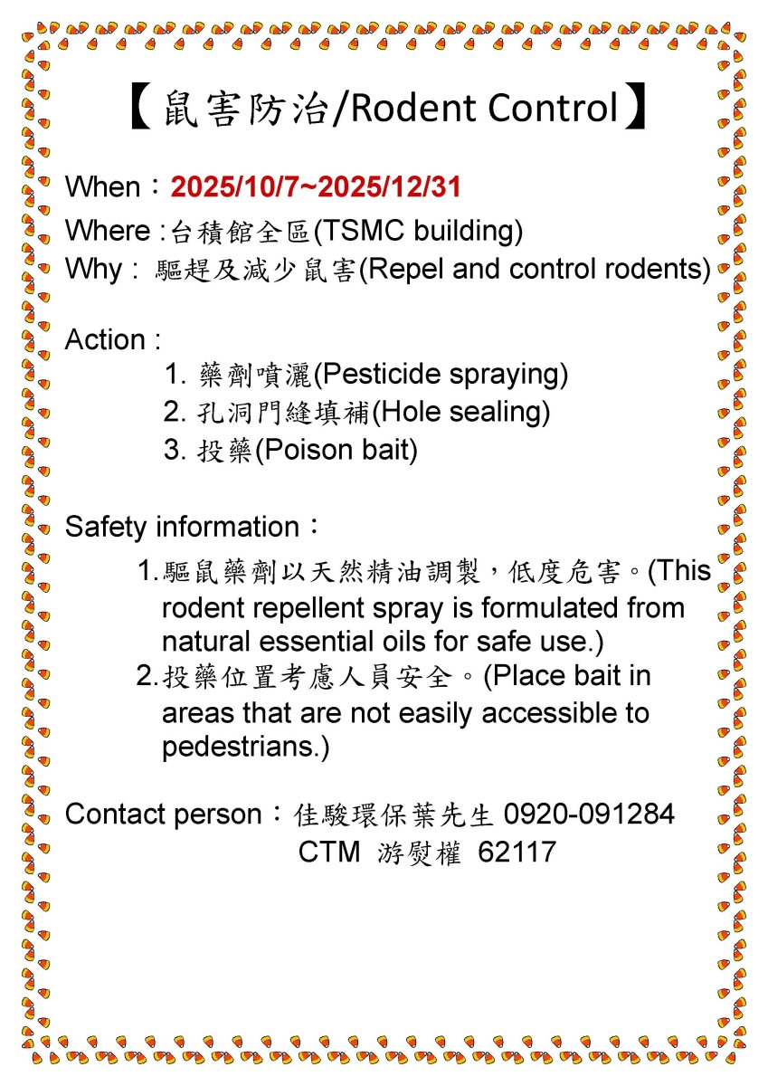 📢【台積館鼠害防治公告 Rodent Control】🐭