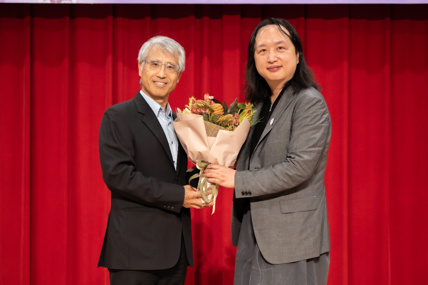 林教授上台致贈花束,感謝唐鳳大使的精彩分享。