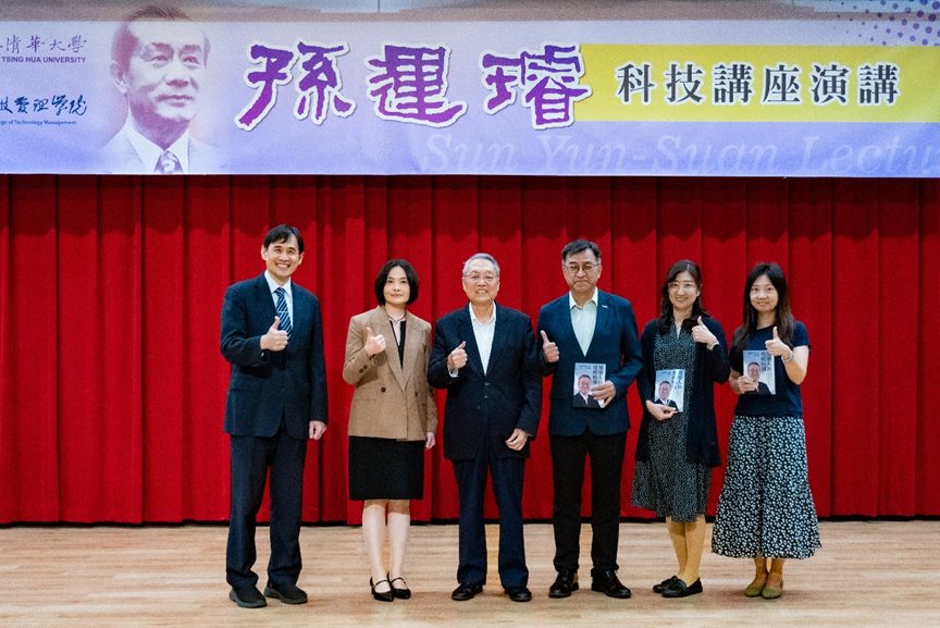 貴賓合照。左起為:丘宏昌教授、彭心儀院長、施振榮董事長、張祥光副校長、索樂晴教授與蔡璧涵教授。