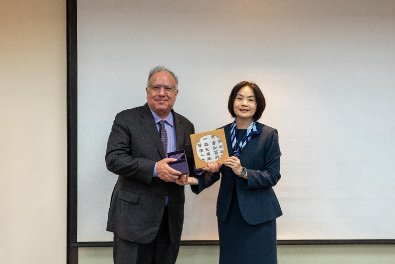 彭心儀院長贈送紀念禮予 Rodriguez 教授,感謝蒞臨演講。