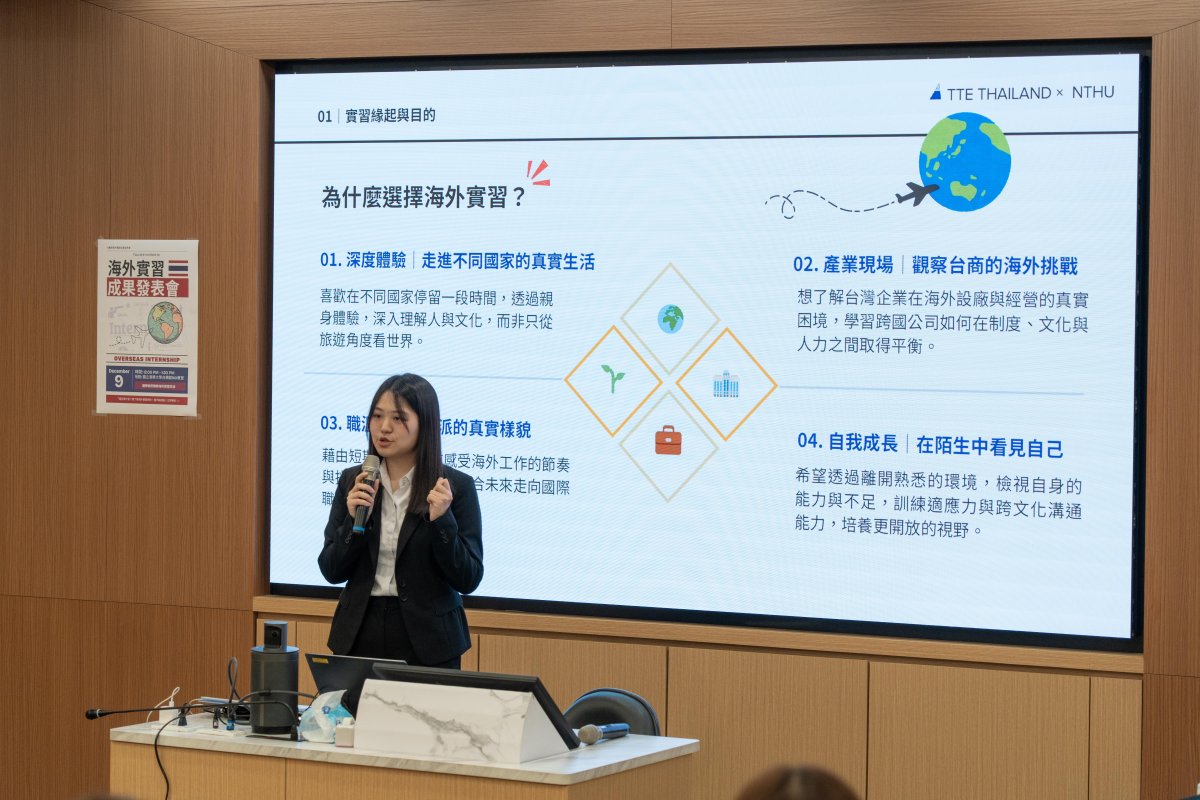 於泰創工程實習的同學林雅芳與吳彩瑜,實際參與 ERP 系統導入、報表整理與規劃等核心專案,並在跨部門、跨文化團隊合作中,累積寶貴的溝通與專案執行經驗;而在泰達電實習的彭湘淇與張恬瑜,則深入廠區實務現場,實際投入生產力提升與自動化流程之優化,在科管院跨領域訓練的基礎下,學習如何即時調整思維與心態,以因應高強度的產業實務挑戰,讓實習歷程成為極具深度的成長洗禮。