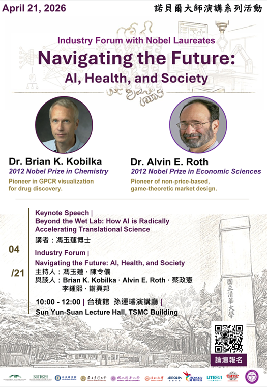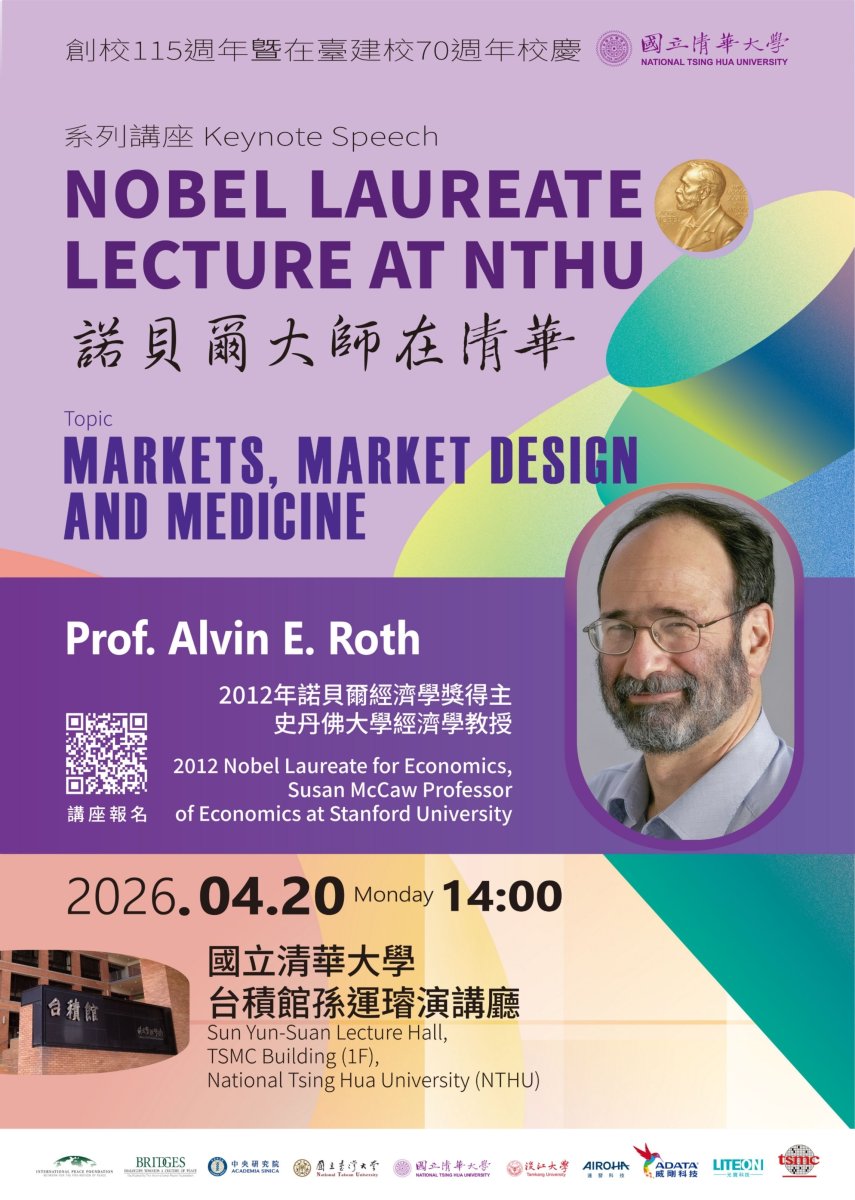 本校非常榮幸將於 2026年4月20日(一)至4月21日(二) 邀請兩位諾貝爾獎大師蒞臨清華大學。屆時將舉辦系列公開演講、產業論壇與師生座談,讓校內師生能近距離親炙大師風采,並進行深度學術交流,相關行程安排如下,誠摯邀請科管院師生共襄盛舉。