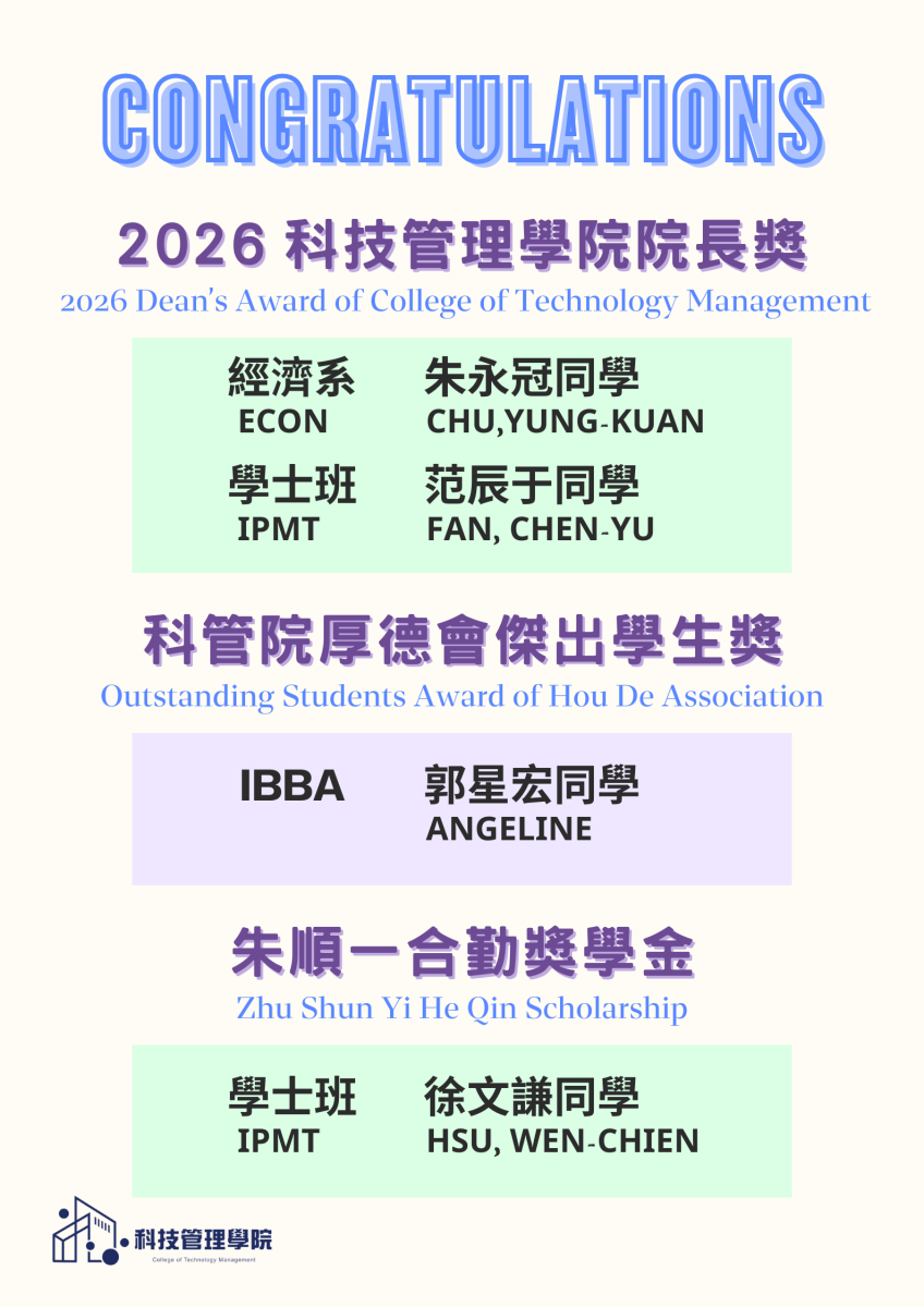 2026 科管院「院長獎」、「厚德會傑出學生獎」及「朱順一合勤獎學金」得獎名單公告