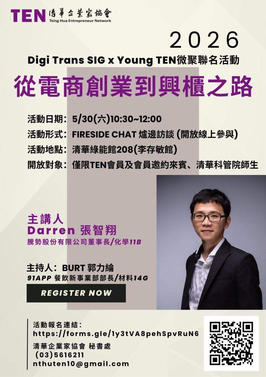活動以Fireside Chat爐邊訪談形式進行,邀請騰勢股份有限公司董事長張智翔學長,與91APP餐飲新事業部部長郭力綸學長對談,分享從電商創業到邁向興櫃歷程中的關鍵決策與實戰經驗。訪談內容將涵蓋FMCG市場趨勢與通路變化、電商品牌數位轉型的經營槓桿(包含AI應用、D2C與OMO策略),以及企業從創業走向資本市場在人才、資本與公司治理上的轉變與挑戰。