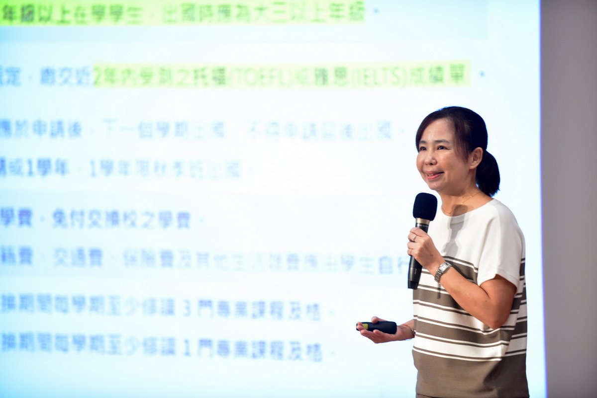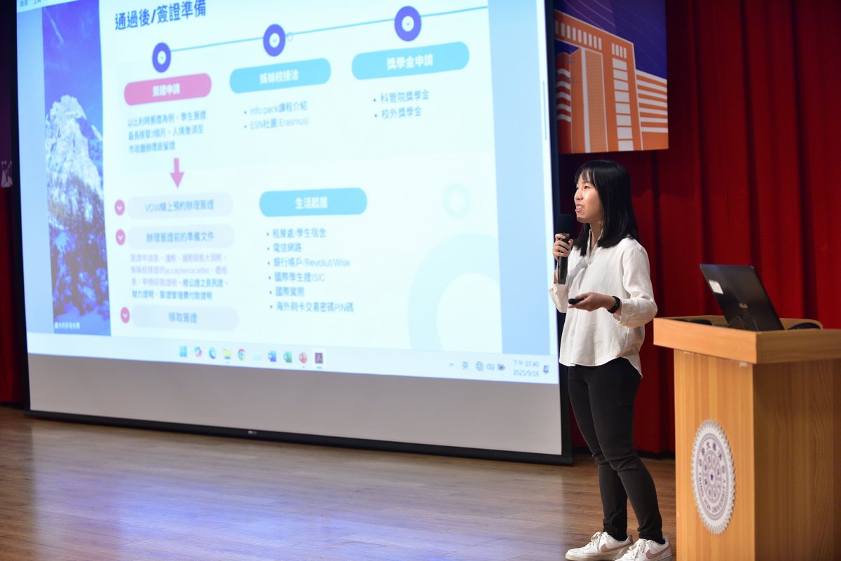 林靜儀老師介紹了科管院獨有的國際辦公室與多元國際資源,鼓勵新生積極規劃未來的交換計畫。她特別提醒,雖然出國交換學習通常在大三後才開始,但現在就能著手準備,為自己的學習旅程打下基礎,並逐步拓展國際視野。