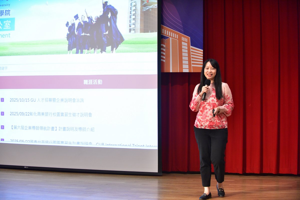 洪老師介紹了職涯辦公室的服務,包含企業徵才說明會與職涯相關課程,幫助同學探索未來發展方向。她也提醒大家多參加各式演講,持續累積新知。